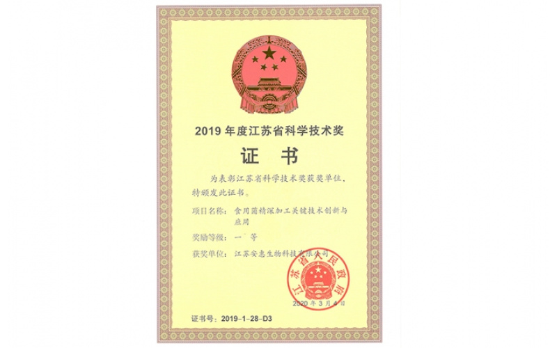 2020年3月,由江蘇安惠生物科技有限公司參與南京財(cái)經(jīng)大學(xué)、南京農(nóng)業(yè)大學(xué)、中國(guó)農(nóng)業(yè)大學(xué)等科研院所承擔(dān)的食用菌精深加工關(guān)鍵技術(shù)創(chuàng)新與應(yīng)用榮獲江蘇省科學(xué)技術(shù)獎(jiǎng)一等獎(jiǎng)。