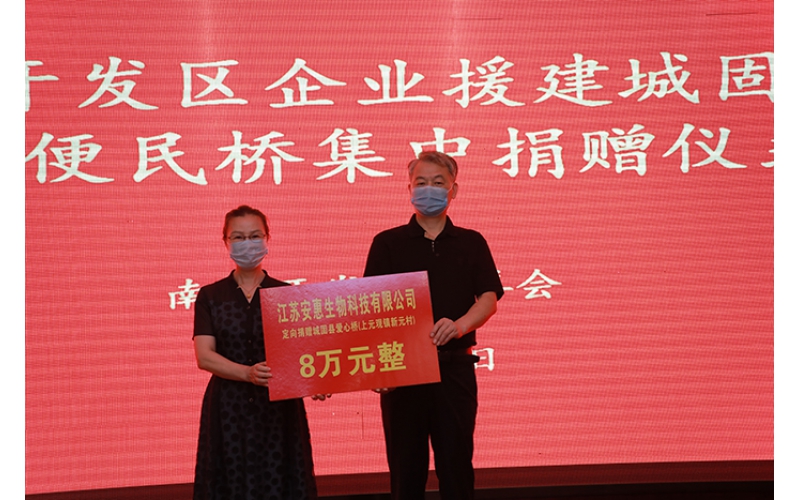 2021年9月3日,在中華慈善日來(lái)臨之際,南通開發(fā)區(qū)企業(yè)援建城固縣愛(ài)心便民橋集中捐贈(zèng)儀式在南通開發(fā)區(qū)星湖101舉行,安惠公司副董事長(zhǎng)陸漢萍出席捐贈(zèng)儀式。